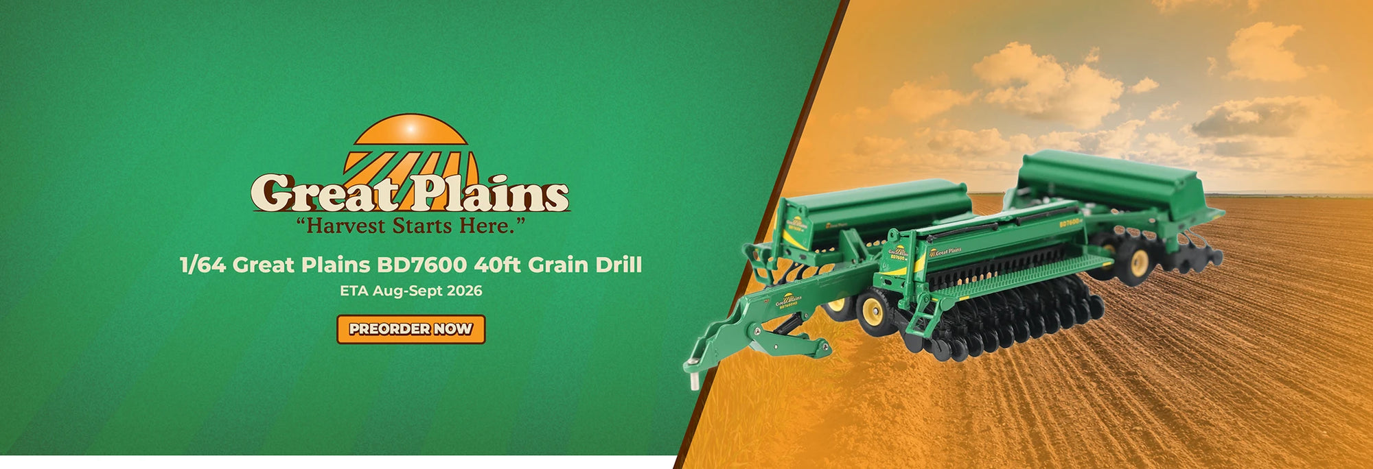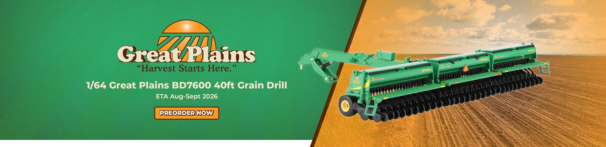 View full detailsGreat Plains Grain Drill Official Great Plains “Harvest Starts Here” scale model replica Authentic Great Plains green decoration and decals Front-...