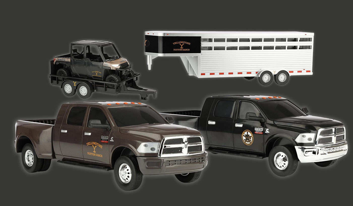Ride into the world of Yellowstone with four standout toys inspired by the hit series, including John & Kayce's RAM pickups, plus the Dutton Ranch horse trailer and UTV—all at can't-miss low prices! 👇