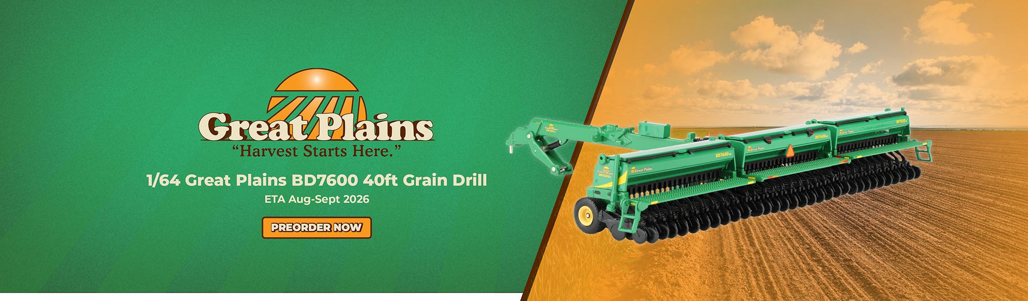 View full detailsGreat Plains Grain Drill Official Great Plains “Harvest Starts Here” scale model replica Authentic Great Plains green decoration and decals Front-...