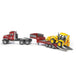 Load the backhoe onto this brand-new MACK truck and move to the next job! Truck and detachable trailer feature fifth wheel clutch, removable side gates, fold-down ramps held by chains to unhook, folding mirrors, opening doors, a folding support bar, a locking device and a tilting cab with viewable engine underneath. The included JCB Backhoe Loader has a fully-functional front loader and backhoe that moves up and down and swings side to side. It features stabilizer legs and a seat that spins around. All of the MACK truck cabs are compatible with the implements designed for the front of the trucks, like the mower and snow plow.