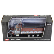 This brown and silver 1/64 scale Peterbilt 379 dump truck is made by First Gear. The dump truck features a quad-axle MAC dump truck body with a removable tarp. The truck features include opening hood with authentic engine detail, poseable front wheels, accurately detailed cab, functioning trailer bed that can raise and lower, and opening trailer door. The truck is made from diecast metal with detailed plastic and rubber wheels. This item is recommended from the manufacturer for ages 14+ years and up.