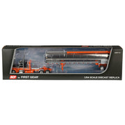 This 1/64 scale die-cast metal replica is made by First Gear, Inc. and is part of the DCP by First Gear replica truck fleet. This model replicates a Peterbilt Model 379 Truck paired with a Walinga Bulk Feed Trailer. The Peterbilt is equipped with a 48 inch flat top sleeper cab. Both the truck and trailer showcase beautiful matching black and orange decoration.