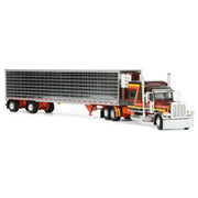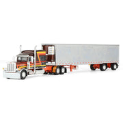 Turn heads in your collection with this Peterbilt 389 Semi Truck Replica paired with a 53' Chrome Reefer Trailer, a limited edition 1/64 scale diecast model by DCP by First Gear. Featuring a deep red paint job with bold orange and yellow striping, this truck captures the classic custom show-truck look. The 70-inch mid-roof sleeper cab, chrome stacks, and highly detailed chrome utility trailer make this rig stand out on any display shelf or farm layout. Built from diecast metal with some plastic components, this collectible measures approximately 16.75 inches long, 2 inches wide, and 2.5 inches high. Perfect for collectors ages 14 and up, this Peterbilt 389 with chrome reefer trailer is a must-have replica for anyone who appreciates premium-quality trucking replicas and detailed craftsmanship.