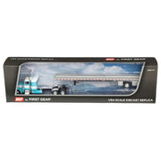 This 1/64 scale Peterbilt 379 semi truck and flatbed trailer from DCP by First Gear features turquoise and green decoration and a 36-inch sleeper cab, capturing the essence of classic Peterbilt long-haul trucks. The trailer includes a silver deck with a black frame, a spread axle configuration, and conspicuity stripes, adding realistic detail to an impressive collectible. Constructed from diecast metal with select plastic components, this 1/64 scale semi truck model is recommended for ages 14 and up and fits seamlessly into any display of 1/64 scale diecast trucks, flatbeds, and farm toys.