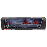 Made by First Gear, this black and red 1/64 scale Peterbilt 379 63” Flattop Sleeper truck is paired with a Transcraft Deck Trailer hauling 2 Bush Hog Wing Mowers. The truck features an opening hood with a detailed engine, accurately detailed cab interior, pivoting fifth wheel for trailer attachment, and detailed chassis and undercarriage. The truck also features Bush Hog logos. This 1/64 scale replica measures approximately 14.5" long, 1.75" wide, and 2.5" high. Per the manufacturer the recommended age is 14+ years and up and is not recommended or intended for play.