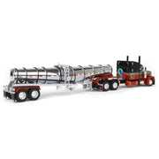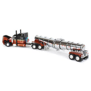 This authentic Peterbilt® Model 379 with 63in Mid-Roof Sleeper diecast metal replica comes paired with a Polar® Deep Drop Tanker Trailer and features an opening hood with authentic engine detail, accurately detailed cab interior, poseable front wheels, pivoting fifth-wheel for trailer attachment, detailed chassis and undercarriage. This quality replica is decorated with a burnt orange and black paint scheme. This 1/64 scale replica measures 12 inches long, 1.75 inches wide, and 2.5 inches high.