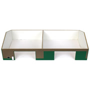 This is a small 1/64 scale model of a basic tan and green 2-door wooden tractor or truck shop, made from MDF wood. It's about 70ft x 130ft in scale with small doors (6in W x 3in H) openings. The roof is removable for a peek inside. Suitable for ages 14+ but not for play.