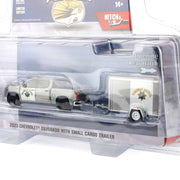 Raw Chase ~ 1/64 2023 Chevrolet Silverado with Small Cargo Trailer, California Highway Patrol, Hot Pursuit Hitch & Tow Series 1