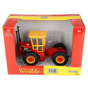 Built tough by ERTL for young hands, this Versatile toy tractor features sturdy diecast metal construction with authentic Versatile decoration and features. Featuring a 4WD configuration, it is equipped with large front and rear single tires. Adding to this toy replica tractor's realism is its free-rolling wheels, articulated steering, clear cab windows and detailed cab interior! Utilize its replica style rear drawbar hitch for attaching most all 1/32 scale ERTL implements!