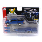 Produced by Auto World, this 1/64 2019 Ford F-150 pickup truck in a blue metallic color with a matching blue trailer. The trailer has removable ramps and is detachable from the truck. The attention to detail is impressive, with the model featuring a realistic interior and exterior, and even miniature versions of the F-150's famous logos and branding. The modeled truck is made from diecast metal with rubber wheels and some plastic parts.
