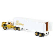 This impressively detailed Mack day cab truck is adorned in beautiful yellow and white decoration. It comes paired with a matching 40 foot vintage trailer, which features “300 Maxidyne” decoration. Together, the truck and trailer have approximate dimensions of 11.75in L x 1.75in W x 2.5in H and an approximate weight of 3lbs.
