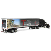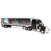 This Peterbilt semi truck replica is made out of die-cast metal by SpecCast! Its trailer features special Gleaner decoration, including a T81 combine, T Series graphic, and “Go Gleaner! T61 T71 T81” text. The truck and trailer both have rolling rubber tires, and the trailer has a functional door. This semi truck has approximate dimensions of 13.5 in L x 1.75in W x 2.5in H. According to the manufacturer, this replica is recommended for ages 14+ years, meaning it is intended for display only and not for play.