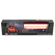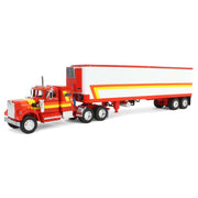 This White Western Star semi truck replica with 40ft vintage livestock trailer and reefer features brand new tooling! This 1/64 scale die-cast metal semi is made by DCP by First Gear and boasts a beautiful red, yellow, and orange color scheme. It has approximate dimensions of 10.5in L x 1.75in W x 2.5in H. According to the manufacturer, this replica is recommended for ages 14+ years, meaning it is for display only and not for play.