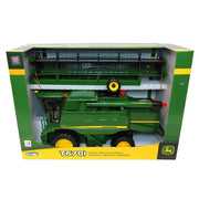 John Deere T6701 combine has great functionality that includes a grain head that turns when combine moves forward, opening side compartments, a bin that opens, cab door that opens, a rear axle that can be steered from the top, an transparent unloader auger that can unload small material from the bin, and it includes a header cart that can be pulled behind the combine.