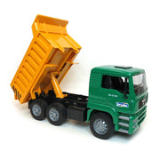 This MAN Tip Up Truck by Bruder is made of very durable plastic. The cab of the Truck tilts forward so you can view the motor. This Tip Up Truck is designed to be the classiest dump truck in the sand box. Collectors are lining up for this MAN Tip Up Truck. It functions like a real dump truck! It has soft rubber tires. The Cargo Bed of this dump truck tilts up, and the mirrors tilt out.