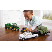 - Playset includes: John Deere R7270 Tractor with removable weights, John Deere 569 Round Baler, John Deere 318G Skid Loader, 2017 Ford F-350 Pickup Truck, Gooseneck Trailer and 10 Round Hay Bales