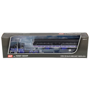 Hit the road in style with this 1/64 scale Peterbilt 389 Semi Truck Replica paired with a 50ft Wilson Spread Axle Grain Trailer by DCP by First Gear. This diecast model features a sleek black and blue paint scheme, a detailed 63-inch flattop sleeper cab, and chrome exhaust stacks for that classic show-truck look. Crafted from high-quality diecast metal with some plastic components, this truck and trailer set offers incredible detail and durability — perfect for any farm toy or trucking collection. Measuring approximately 15.75" long, 2.00" wide, and 3.00" high, this replica makes a bold statement on display. Designed for ages 14 and up, it’s great for collecting and display, not for play. A must-have addition for fans of Peterbilt, Wilson trailers, and First Gear diecast trucks!