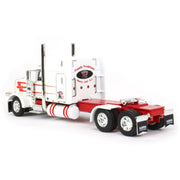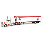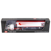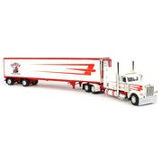 Made by First Gear, this white & red 1/64 scale Peterbilt 389 w/ 63” mid roof sleeper cab semi is paired with a utility ribbed spread axle Thermo King refrigerated trailer. The truck features Dawes Contract Carriage decals. The truck features an opening hood with detailed engine, pivoting fifth-wheel, functioning landing gear, opening trailer doors and detailed undercarriage. The truck and trailer are made from diecast metal with detailed plastic and rubber wheels. Per the manufacture, this item is recommended for ages 14+ years and up and is not recommended for play.