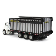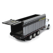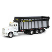This 1/64 scale Peterbilt 385 truck and H&S Forage Box is an exclusive run made by SpecCast. It features an H&S 1226 Big Dog series forage box. This replica is made from die-cast metal with some plastic parts and rubber tires. It features a single opening door on the trailer. According to the manufacturer, this replica has a recommended age of 14+ years, meaning it is for display only and not for play.