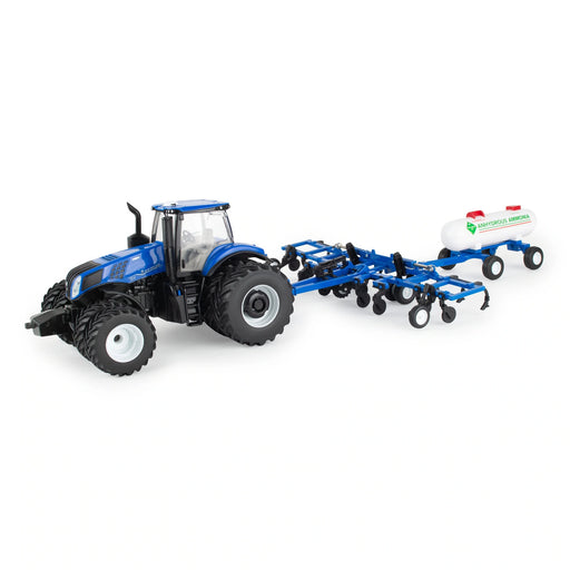 New Holland T8.385 Tractor Replica Set Paired with a blue AA Applicator and an Anhydrous Ammonia Tank with blue frame Tractor equipped with front ...