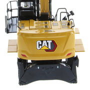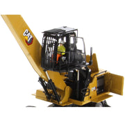 Made by Diecast Masters, the 1/50 scale CAT MH3040 Material Handler from the High Line Series is a detailed replica meant for display only, recommended for ages 14 and up. It features realistic paint, decals, and a detailed interior. The cab can be lifted and lowered, while the boom is fully movable with an adjustable grapple. The body rotates, front wheels are steerable, and stabilizers are adjustable. The model also includes an opening engine compartment with intricate details and comes with an interchangeable grapple attachment. Approximate dimensions: 17.375 inches long, 3.125 inches wide, and 3.375 inches high.