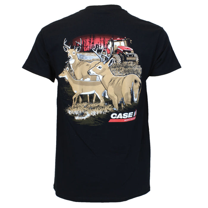 This is an Case IH graphic Adult t-shirt. A very soft 100% cotton construction. The color scheme of the shirt is black with Case IH logo on the front of the shirt, and Case IH Magnum in a field of deer on the back of the t-shirt. Per the manufacturer the t-shirt is machine wash and tumble dry. True to size for most adults.