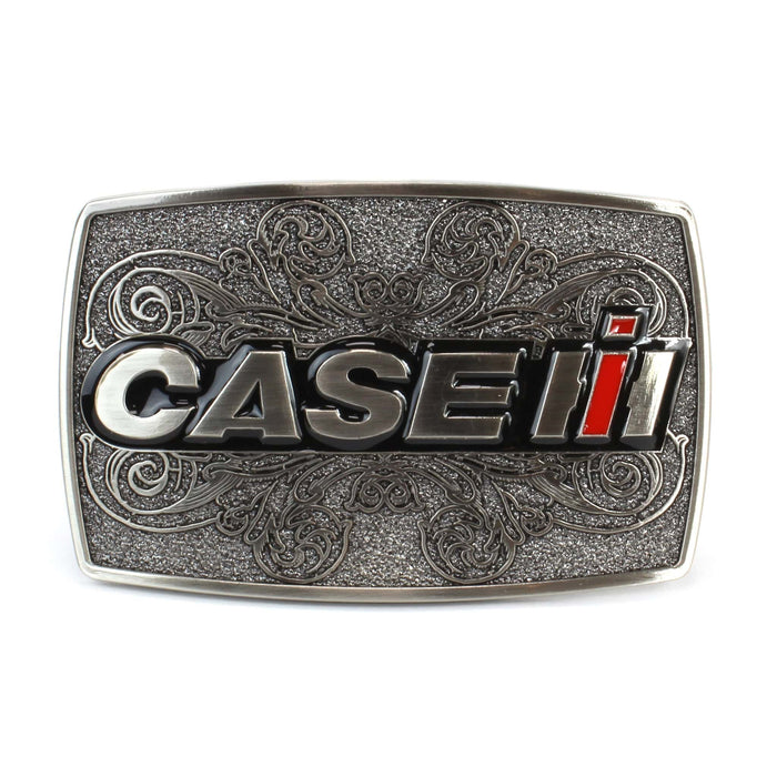 Made by SpecCast, this is a Western Style Belt Buckle featuring the Case IH logo. This is a highly collectible piece and is officially licensed as Case IH merchandise. It features a silver rounded rectangle shape and a western-style design on its background. The buckle has a hook style closure and will accommodate up to a 1.5" wide belt. This belt buckle is made of solid metal. Recommended for ages 14+. Measures approximately 3.375"W X 2.375"H.