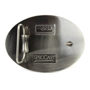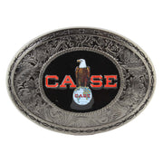 Made by SpecCast, this is a Case Old Abe Eagle Western Style Buckle. It features a Case Old Abe Eagle on the globe in color on a black background. It sports a western style design with a barbed wire border. This buckle has a hook style closure and is made of solid metal. It will accommodate up to a 1.5" wide belt. Recommended for ages 14+. Measures approximately 3.375"W X 2.375"H.