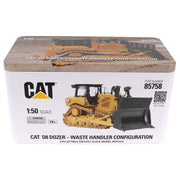 This 1/50 scale replica of the CAT D8 Dozer with Waste Handler Configuration is made out of die-cast metal by Diecast Masters. This highly detailed replica features authentic CAT Machine Yellow paint and authentic CAT Modern Hex trade dress. It is equipped with metal railings and grab handles, realistic metal tracks, a highly detailed landfill blade, a removable cabin roof and a removable operator figure (included).
