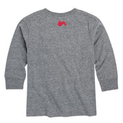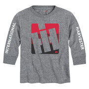 This is an International Harvester graphic T-shirt. The long sleeve shirt is a light grey color body and fits true to size to most children. The graphic on the shirt is an red graded IH logo on the front of the body and "International Harvester" up the sleeves. Per the manufacture the shirt can be machine washed and tumbled dry.
