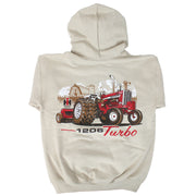 Dress your young farm enthusiast in the Youth IH Farmall 1206 with Duals Hooded Sweatshirt. This long-sleeve hoodie, available in youth sizes, comes in an off-white/cream colorway. The back features a striking graphic of a Farmall 1206 Diesel Tractor set against a picturesque farm background. The front proudly displays the IH logo. With a front hoodie pocket and crafted from a comfortable blend of 80% cotton and 20% poly fleece, this hoodie provides warmth and style for young tractor fans.
