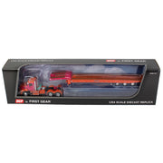 The 1/64 Orange & Fuchsia Mack Pinnacle with Talbert 5553TA Traveling-Axle Trailer, DCP by First Gear, is a striking and eye-catching model that will surely stand out in any collection. The Mack Pinnacle truck features a vibrant orange and fuchsia color scheme, adding a touch of uniqueness to the design. Its realistic details, including accurately replicated headlights, grille, and side mirrors, showcase the manufacturer's commitment to precision. The Talbert 5553TA Traveling-Axle Trailer complements the truck with its high-quality construction and movable axles for added authenticity. This combination of a bold-colored Mack Pinnacle and a versatile Talbert trailer makes for an exquisite addition to any truck enthusiast's lineup. The intricate craftsmanship and attention to detail make this model a must-have for collectors and truck enthusiasts alike.
