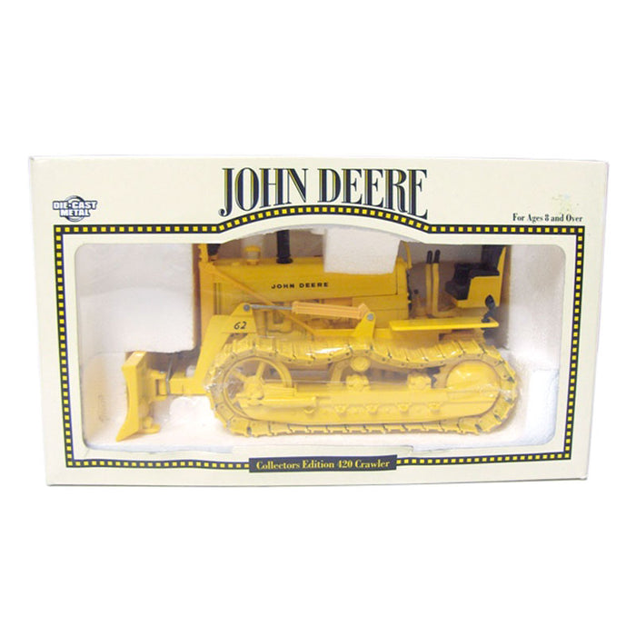 The 1/16 Collector's Edition John Deere 420 Industrial Crawler is made by ERTL. It features a die-cast metal frame, body, and tracks with some plastic components.