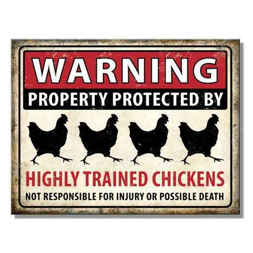 Highly Trained Chickens property protection tin sign Made in the USA Comes with 2 pre-drilled mounting holes (mounting hardware not included) Inte...