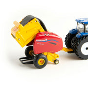 The 1/64 ERTL Farm Country New Holland dairy barn lets youngsters experience the best of country living, whether they are in the heart of farm country or the middle of the city. The New Holland barn comes in New Holland blue and the New Holland logo is prominently featured on the roof as well as above the sliding doors. This set includes the 1/64 T6.165 Tractor and Roll-Belt 560 Round baler as well as the easy to assemble plastic buildings, animal figures and a generous helping of accessories.