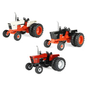This set includes three (3) different individually packaged Case 1070 tractors, including one (1) regular unit with classic JI Case decoration, one (1) Chase Unit with gloss black decoration, and one (1) Chase Unit with Case IH Red decoration (more about this unit below!). Each of these diecast metal tractors features a unique open station configuration and is equipped with a 2WD front axle, rear duals, diecast metal wheels, diecast rear fenders and a chrome exhaust stack.