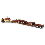 This Tan & Amber 1/64 scale Peterbilt 389 63” Flat Top Sleeper Cab Semi Truck is made by First Gear. The semi truck is paired with a Fontaine Magnitude lowboy tri-axle trailer, boosters and Stinger. The truck features an opening hood with authentic engine detail, poseable front wheels, accurately detailed cab interior, pivoting fifth-wheel for trailer attachment, and detailed chassis and undercarriage. The truck and trailer are made from diecast metal with detailed plastic and rubber wheels. This item is recommended from the manufacturer for ages 14+ years and up and is not recommended for play.