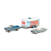 The 1/64 1967 F-250 with Enclosed Car Hauler & 1966 Thunderbird from Hollywood Hitch & Tow Series 13 is a highly detailed diecast replica by Greenlight Collectibles. This collectible set includes a 1967 F-250, a dusty 1966 Thunderbird Convertible, and an enclosed car trailer with an opening rear hatch. Featuring diecast metal chassis and rubber tires, this set is recommended for ages 14+ and intended for display only.