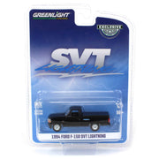 The 1/64 1994 Ford F-150 SVT Lightning with Tonneau Bed Cover in Black is a Hobby Exclusive diecast metal replica produced by Greenlight Collectibles. Intended for display purposes only and not suitable for play, this detailed model features a diecast metal chassis, rubber tires, and some plastic components. The 1994 Ford F-150 SVT Lightning is meticulously crafted, and the Tonneau Bed Cover adds to its authentic appearance. With approximate dimensions of 3.25 inches in length, 1.25 inches in height, and 1.25 inches in width, this Hobby Exclusive piece is an excellent addition to any collection, showcasing the iconic design of the Ford F-150 SVT Lightning.