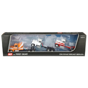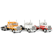 Toy truck and Ford enthusiasts, rejoice! Introducing a new-for-2025 1/64 scale Ford LTL 9000 Trio Set from DCP by First Gear. These Ford toy truck replicas are adorned in beautiful classic Ford paint schemes. The set comes with two day cab versions of the truck (one in white and one in red & white) and a 60in flat top sleeper cab version in orange and white.