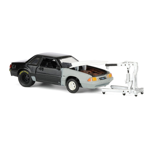 1/64 replica made by Greenlight Collectibles Limited edition LP Diecast exclusive 1987 Ford Mustang LX Includes engine hoist Approximate measurem...