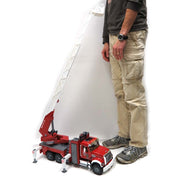 What could be more exciting than playing firemen? The new exciting feature in the BRUDER fire brigade range is the MACK granite fire engine with ladder. As well as many small details such as opening doors, mirrors that fold back, opening bonnet and lots of chrome parts, the vehicle has an integrated water tank that can be easily filled. The water hose can be wound up, held by BRUDER figures (e. g. item. no. 60000 – not supplied), or secured to the basket. It also has a fully functioning nozzle. The turntable ladder with rescue basket can be moved out by a hand wheel and adjusted in height. The cab has two seats and there is another seat for a BRUDER figure on the ladder. Four extendable support legs ensure vehicle stability in any situation and a large storage compartment with a door that folds up means there is extra space for storing tools. The many functions and details allow limitless creative games.