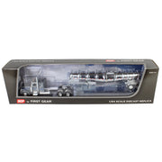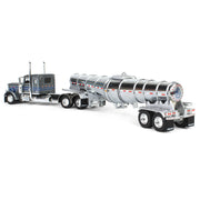 Rolling into a collection near you: the Circle B Trucking 389 semi truck! This semi comes with a Peterbilt 389 Truck and a Polar Deep Drop Tanker Trailer. The truck is equipped with a 36 inch bunk sleeper cab. Its trailer features beautiful chrome decoration. This 1/64 scale replica from DCP by First Gear is made out of die-cast metal. According to the manufacturer, it is recommended for ages 14+ years, meaning it is great for collecting but not for play.