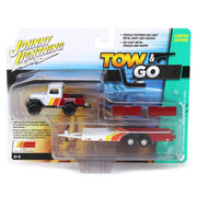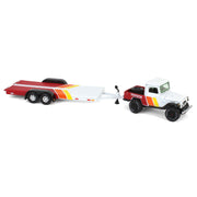 1/64 1980 Toyota Land Cruiser with Open Car Trailer in White with Custom Toyota Deco, Johnny Lightning