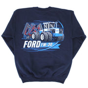 The Youth Ford FW-30 with Wing Disk Navy Crew Neck Sweatshirt is a blue, long-sleeve crewneck sweatshirt available in youth sizes. It features a detailed back graphic of a Ford FW-30 tractor with a wing disk. Made from a comfortable 50% cotton and 50% polyester blend, this sweatshirt is perfect for young Ford tractor fans.