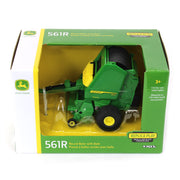 The 1/32 John Deere 561R Round Baler with Bale, manufactured by ERTL, is recommended for ages 3 and up. This scale model is constructed with a die-cast body and features an openable rear bale chamber. It also comes with a new mounted preservative tank and includes one round bale. The approximate measurements for the baler are 6 inches in length, 4.25 inches in width, and 4 inches in height.