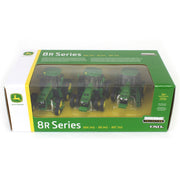 This beautiful 1/64 scale set of all three current John Deere 8R configuration tractors is made by ERTL. The set comes with the following tractors, each packaged together in a window box: John Deere 8R 340, John Deere 8RX 340 and John Deere 8RT 340. Each item is constructed with die-cast metal. Details include external mirrors, warning arms and clear cab windows with detailed interiors. Each has a three-point hitch that is raiseable and lowerable. According to the manufacturer, this replica is recommended for ages 14+ years, meaning it is designed for display only and not for play.