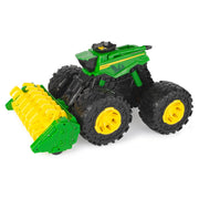 Go big or go home! This ginormously scaled Monster Treads combine measures nearly 18"L x 10.5"W x 9.5"H and is the largest Monster Treads toy ever created! It also features lights and sounds activated by three different buttons. Additionally, it features super bouncy tires, uniquely designed tire treads and a spinning combine head that is activated by rolling the combine forward. The best of both worlds collide when the power of John Deere meets monster vehicle styling!