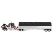 Introducing the 1/64 scale Kenworth W900A Semi Truck replica with 43ft Wilson Pacesetter Grain Trailer from DCP by First Gear. This exceptionally detailed tractor trailer features brand new aftermarket parts tooling! The Kenworth truck is equipped with a 36 inch sleeper cab and is adorned in sleek gray, viper red and black decoration. The Wilson trailer features gray decoration and is equipped with a black tarp and a dual axle.