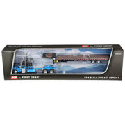 Haul in style with this Peterbilt 389 Semi Truck Replica paired with a Landoll 440B-50CA Traveling Axle Trailer by DCP by First Gear. This 1/64 scale diecast truck and trailer set showcases new parts tooling and an eye-catching blue and black paint scheme, making it a standout addition to any farm or trucking collection. The Peterbilt 389 features a 48-inch flattop sleeper cab, detailed interior, and gleaming chrome stacks for an authentic, high-end look. The Landoll 440B-50CA trailer includes realistic traveling axle detail, perfect for displaying your favorite equipment models. Built from diecast metal with some durable plastic components, this highly detailed semi and trailer replica measures approximately 15.25 inches long, 1.75 inches wide, and 2.5 inches tall. Recommended for collectors ages 14 and up, this Peterbilt 389 and Landoll trailer replica model is ideal for display—not play—and a must-have for diecast truck enthusiasts.